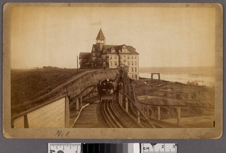 Today’s image is of “passengers riding the Thompson Gravity Switchback Railroad at the Arcadia Hotel near the beach in Santa Monica, California, with the Ocean Avenue face of the hotel visible” (https://hdl.huntington.org/digital/collection/p15150coll2/id/19483). This little roller coaster “was outside the luxurious-for-the-time Arcadia Hotel in Santa Monica and carried passengers 500 feet from a Southern Pacific station across a ravine to the hotel” (https://martinturnbull.com/photo-blog/2018/09/27/a-thompson-gravity-switchback-railway-in-front-of-the-arcadia-hotel-santa-monica-1890-2/), so it was functional as well as fun.